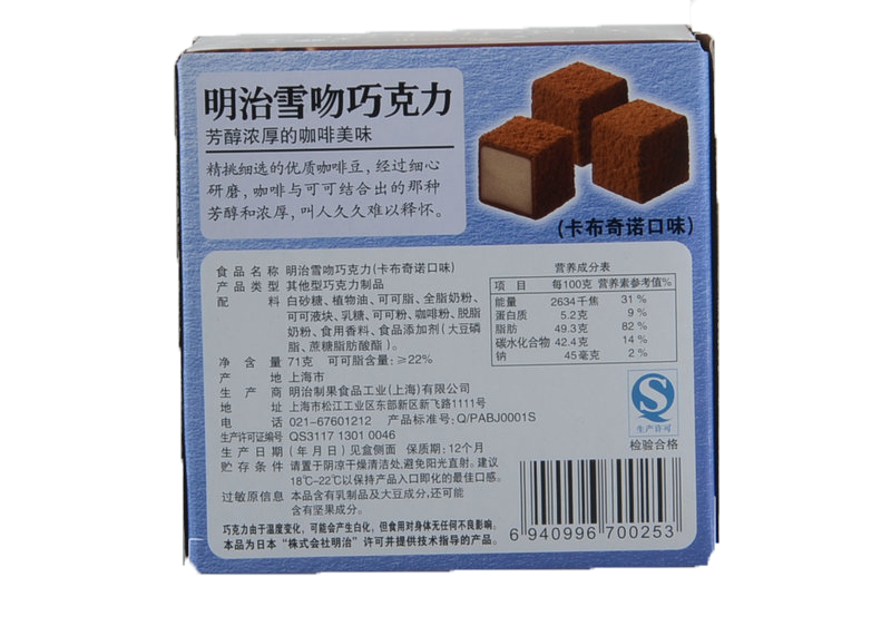 特色:明治雪吻巧克力,雪般轻盈,吻般甜美。芳醇浓厚的咖啡美味,精挑细选的优质咖啡豆,经过细心研磨,咖啡与可可结合出的那种芳醇和浓厚,叫人久久难以释怀。